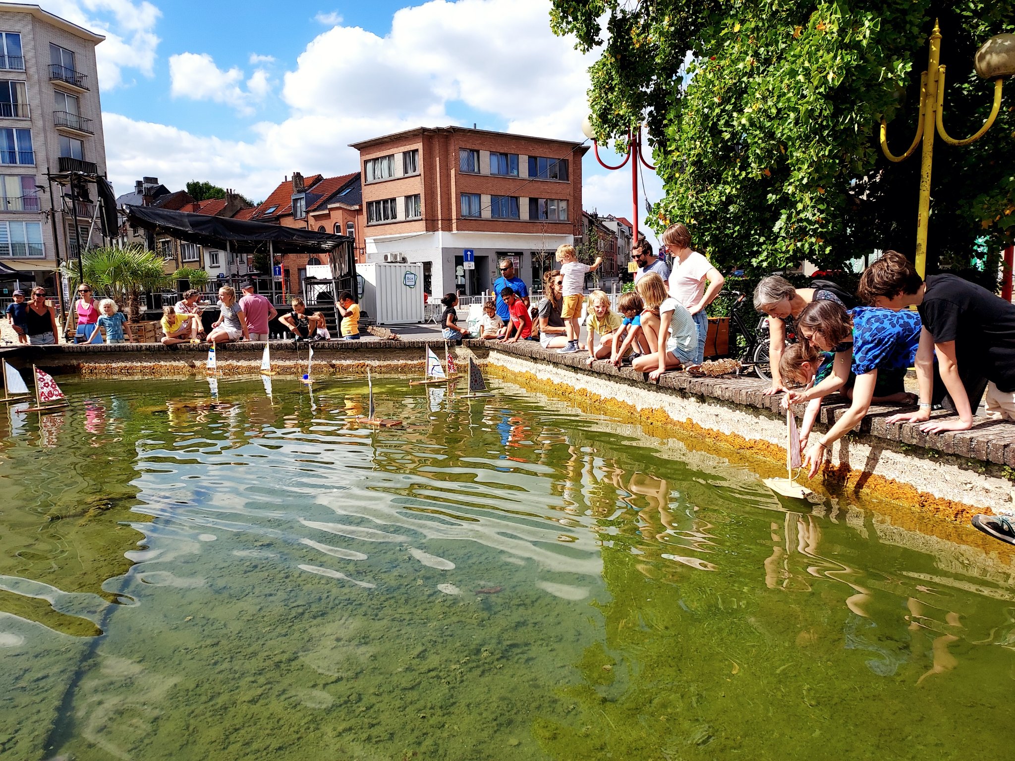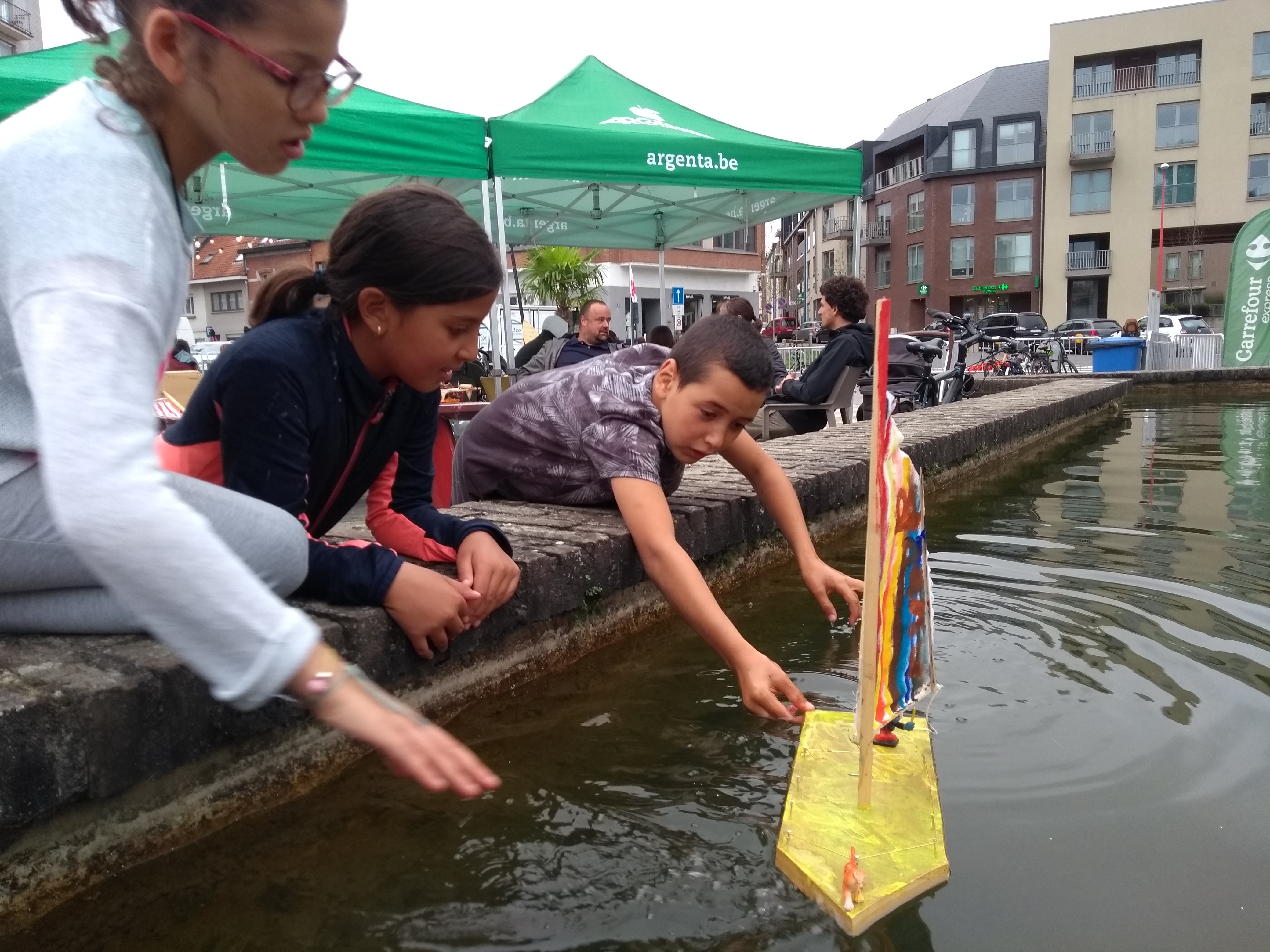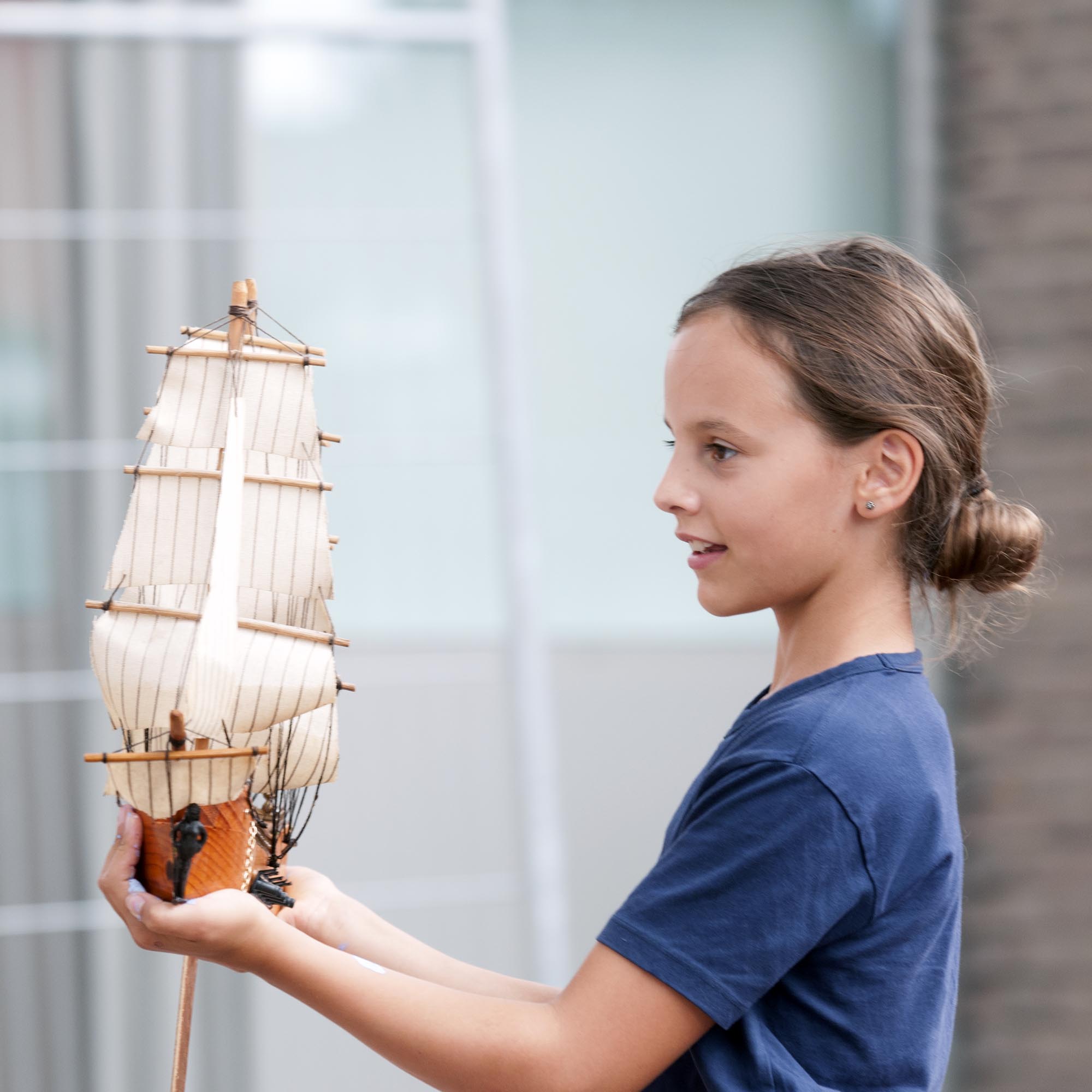 We maken zelf een drijvende, varende boot met recuperatie houtmateriaal, een stukje oude windvlieger, zeildoek, enkele andere attributen en een heus boegbeeld.