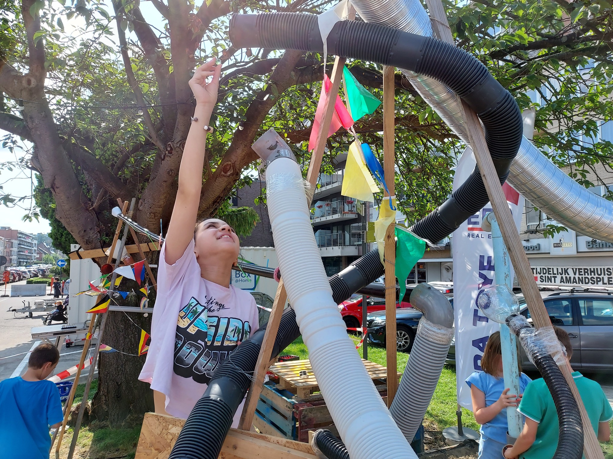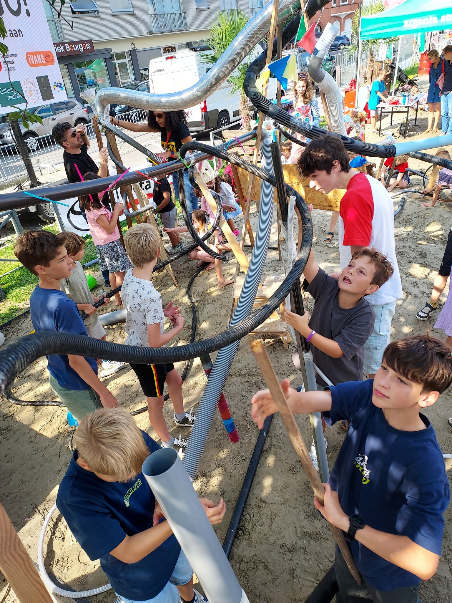 Vanaf 16/08 zomerde het opnieuw op festival Strombeach ’24 in Strombeek-Bever! Ook dit jaar waren we graag van de partij, en bouwden samen met kinderen en papa’s/mama’s een reuzeknikkerbaan met allerhande recuperatiemateriaal. Uiteraard met wat ‘speciallekes’ :-). We lieten de fantasie de vrije loop, brachten alle materiaal en dingen mee waar knikkers in kunnen rollen, drijven en vliegen, en bouwden een knaller van een baan!